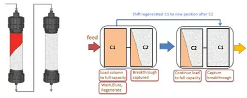 ? ? 傳統(tǒng)層析工藝,由于流穿效應(yīng),有30-50%的填料是無(wú)法被完全利用的,從而使得載量和處理量大為受限。Capture SMB用于優(yōu)化捕獲環(huán)節(jié),作為最簡(jiǎn)單和最優(yōu)化的2柱位設(shè)計(jì),可使純化效率顯著提高,并且使填料用量大為縮減。