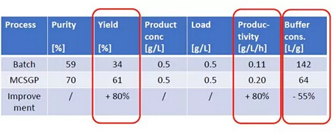 ? ? 有案例證明,MCSGP可將產(chǎn)品純度從傳統(tǒng)工藝的59%提升至70%,將收率從傳統(tǒng)工藝的34%提升至61%,從而使產(chǎn)量(g /L /h)整體提升80%,并同時(shí)使Buffer的消耗量降低55%。MCSGP工藝,無(wú)疑可顯著地節(jié)約成本投入,并可產(chǎn)生更多的生產(chǎn)效益。