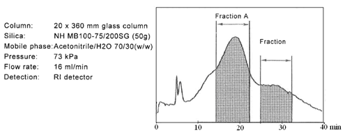 迄今為止,大多數(shù)糖類的分離介質(zhì)僅僅局限在分析級(jí)別,但是富士硅膠研發(fā)出用于制備色譜的新的氨基硅膠。當(dāng)使用高水相為流動(dòng)相時(shí),一般的氨基填料會(huì)暴露出很多問(wèn)題。氨基硅膠的pH值很高,一般pH為9.0,在這樣高的pH條件下,目標(biāo)化合物一般都會(huì)變性,并且會(huì)毀壞硅膠基質(zhì)的表面。考慮到這些問(wèn)題,富士公司研發(fā)出新的氨基硅膠填料,稱之為NH SG硅膠。NH SG硅膠可以最小化甚至是避免上述問(wèn)題,并且對(duì)糖類化合物進(jìn)行更好的分離。