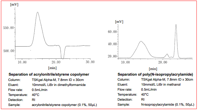 1. TSKgel Alpha系列色譜柱由親水性球形聚甲基丙烯酸酯顆粒填充。