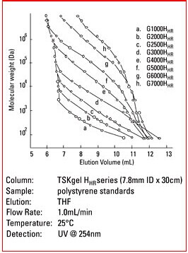 3. Hhr型色譜柱為常規(guī)的GPC色譜柱,尺寸為7.8mm ID x30cm。當使用此類常規(guī)色譜柱時,大多數的HPLC系統(tǒng)無需進行針對柱外峰展效應的優(yōu)化。