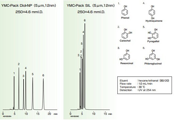 上圖顯示了苯酚在YMC-Pack Diol-NP色譜柱和YMC-Pack SIL色譜柱上在相同條件下的不同選擇性,YMC-Pack Diol-NP色譜柱提供更長的保留時間和更好的分離效果。