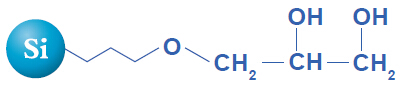 二元醇基鍵合色譜柱在正相條件下,較硅膠色譜柱,能夠更好地識別化合物的親水性差異。利用這個特性的效應,實現了親水性差異較小的化合物的相互分離。并且,通過均一的二元醇基處理,防止了硅烷醇基的影響所造成的水的非特異性吸附,因此,可使用水100 %洗脫液進行清洗。可輕松地清洗吸附在填料上的高極性化合物,長期使用色譜柱。并且,較硅膠色譜柱,樣品負荷量大,最適于制備HPLC。