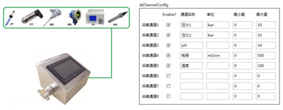系統(tǒng)提供8路傳感器通道,可接受4~20mA及-10V~+10V的信號(hào)輸入,可連接絕大部分類(lèi)型的傳感器,比如:壓力、溫度、流量、電導(dǎo)、pH、UV等。