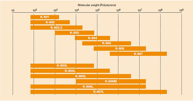 GPC K-803L是標準的油溶性SEC色譜柱,適用于從低分子量到高分子量的寬范圍的樣品。GPC KF-803L色譜柱是適合分子量分布廣的樣品的混合填料色譜柱。流動相是氯仿。