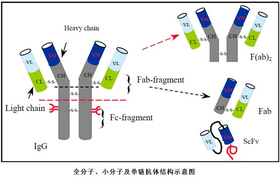 抗體的重鏈可變區以及輕鏈(VH+VL),通過一段多肽連接,形成單鏈抗體的可變區(ScFv)。穿透力強但往往親和力下降。分子量在~25kDa。Alexion?Pharmaceutical公司研制的Pexelizumab,主要用于治療冠狀動脈疾病。