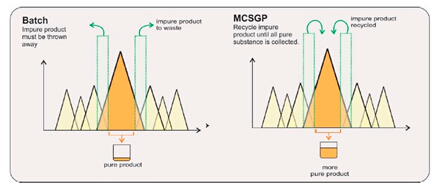 Contichrom層析系統(tǒng)所特有的MCSGP功能(Multicolumn Countercurrent Solvent Gradient Purification),可將目標產(chǎn)物與雜質(zhì)的重疊部分回收,進行循環(huán)式的層析操作,從而最大限度地提純產(chǎn)品,使得純度和收率二者兼得。運行MCSGP功能時,各cycle僅將最純組分收作目標產(chǎn)物,從而保證了高純度;各cycle均將重疊部分進行回收再上樣,從而保證了高收率。