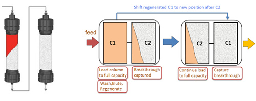 傳統親和層析工藝,由于流穿效應,有40-60%的填料是無法被利用的,從而使得載量和處理量大為受限。Capture SMB用于優化捕獲環節,作為最簡單和最強大的2柱位設計,可使純化效率顯著提高,并且使填料用量大為縮減。