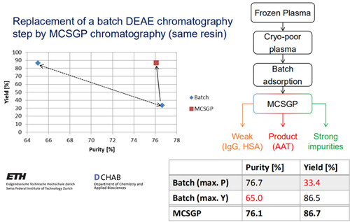 從血漿中純化AAT需采用DEAE離子交換層析,有研究表明,采用單柱Batch工藝純化AAT,產品純度76.7%時,收率為33.4%;產品純度65.0%時,收率為86.5%,純度和收率此消彼長。采用MCSGP工藝后,可在產品純度76.1%時,仍保證收率為86.7%