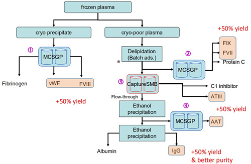 連續流層析可應用于血液制品純化的多個階段,有效提高純化效率,改善收率和純度,詳見下圖:
